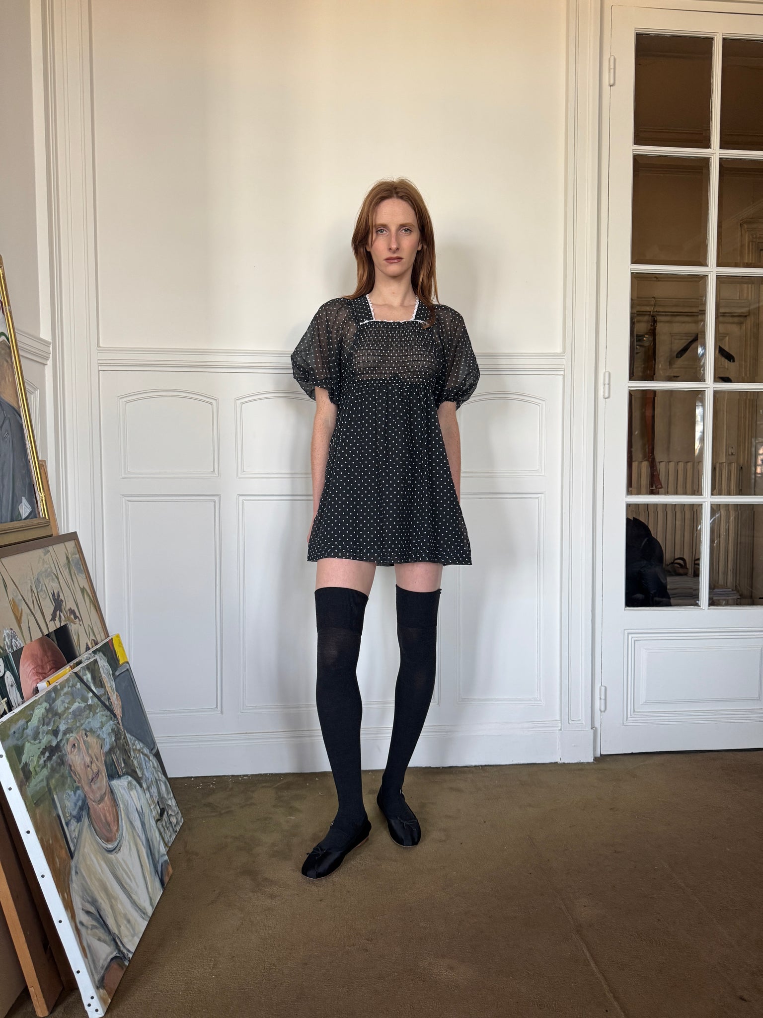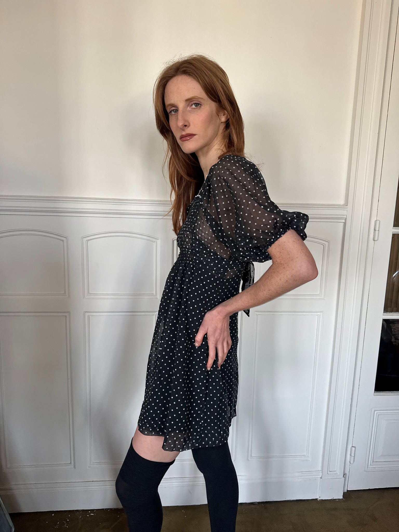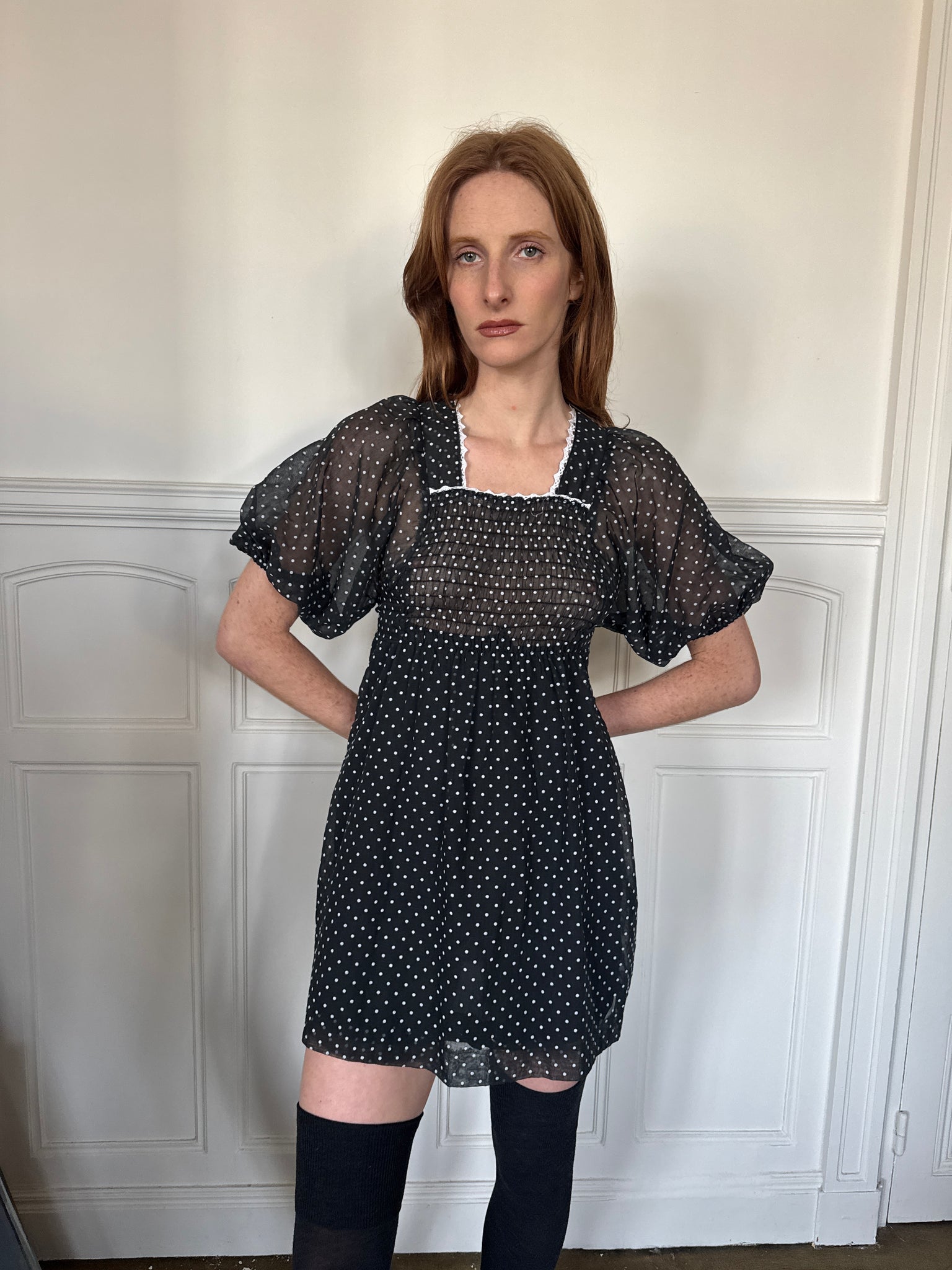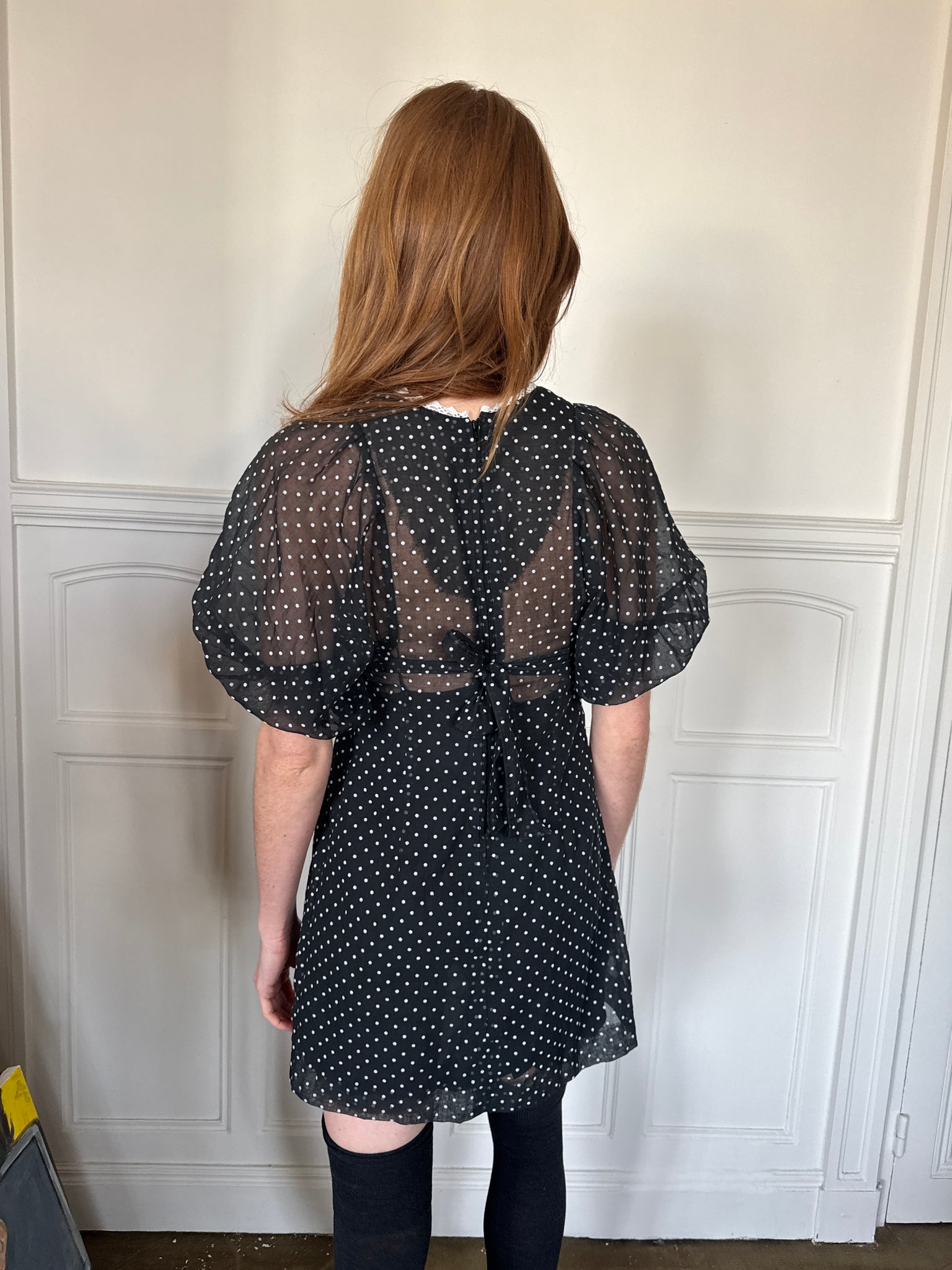 1970s black and white polka dots sheer mini dress, balloon sleeves, ties to adjust the empire waist, zipper in the back, white trimming