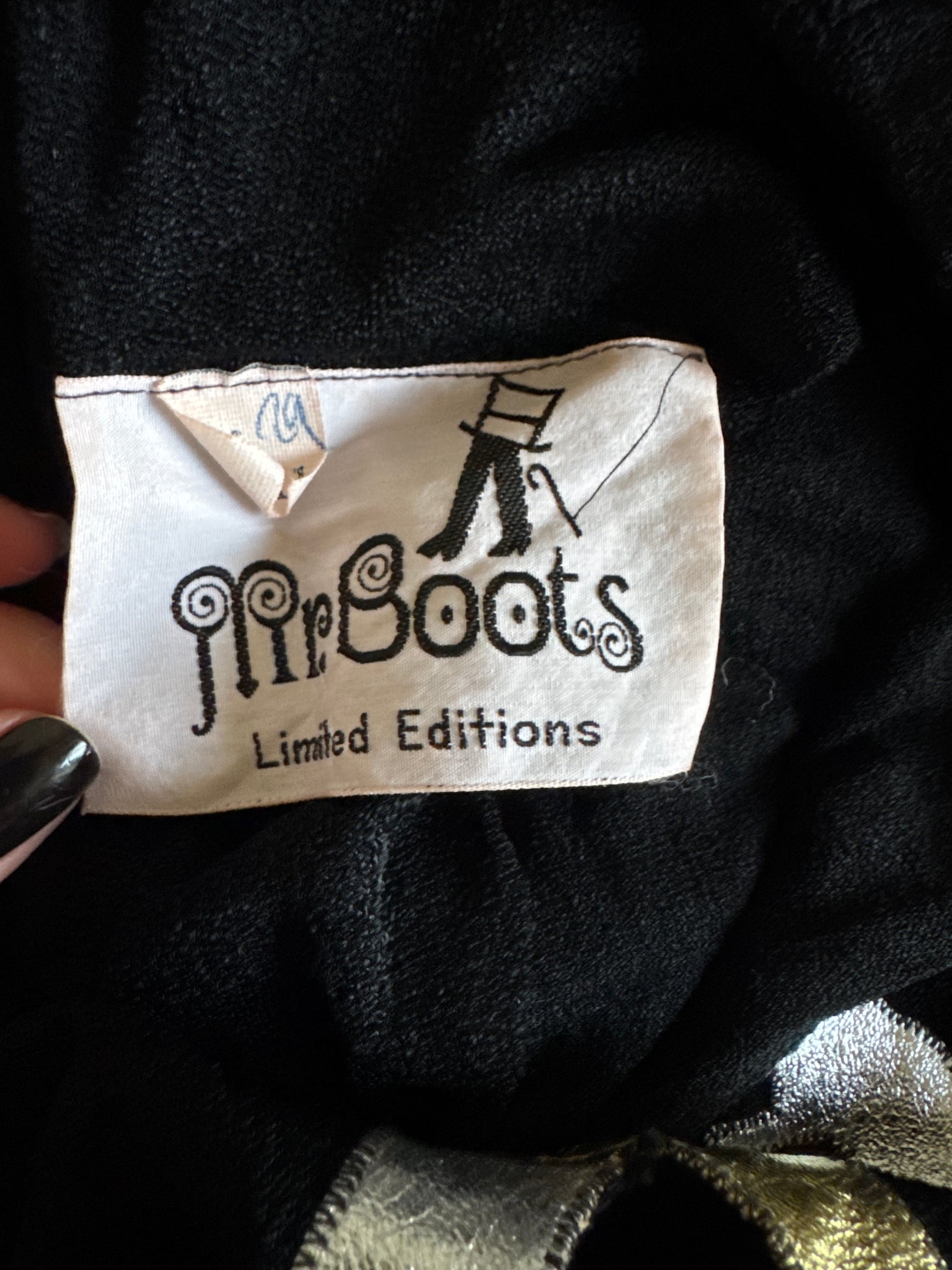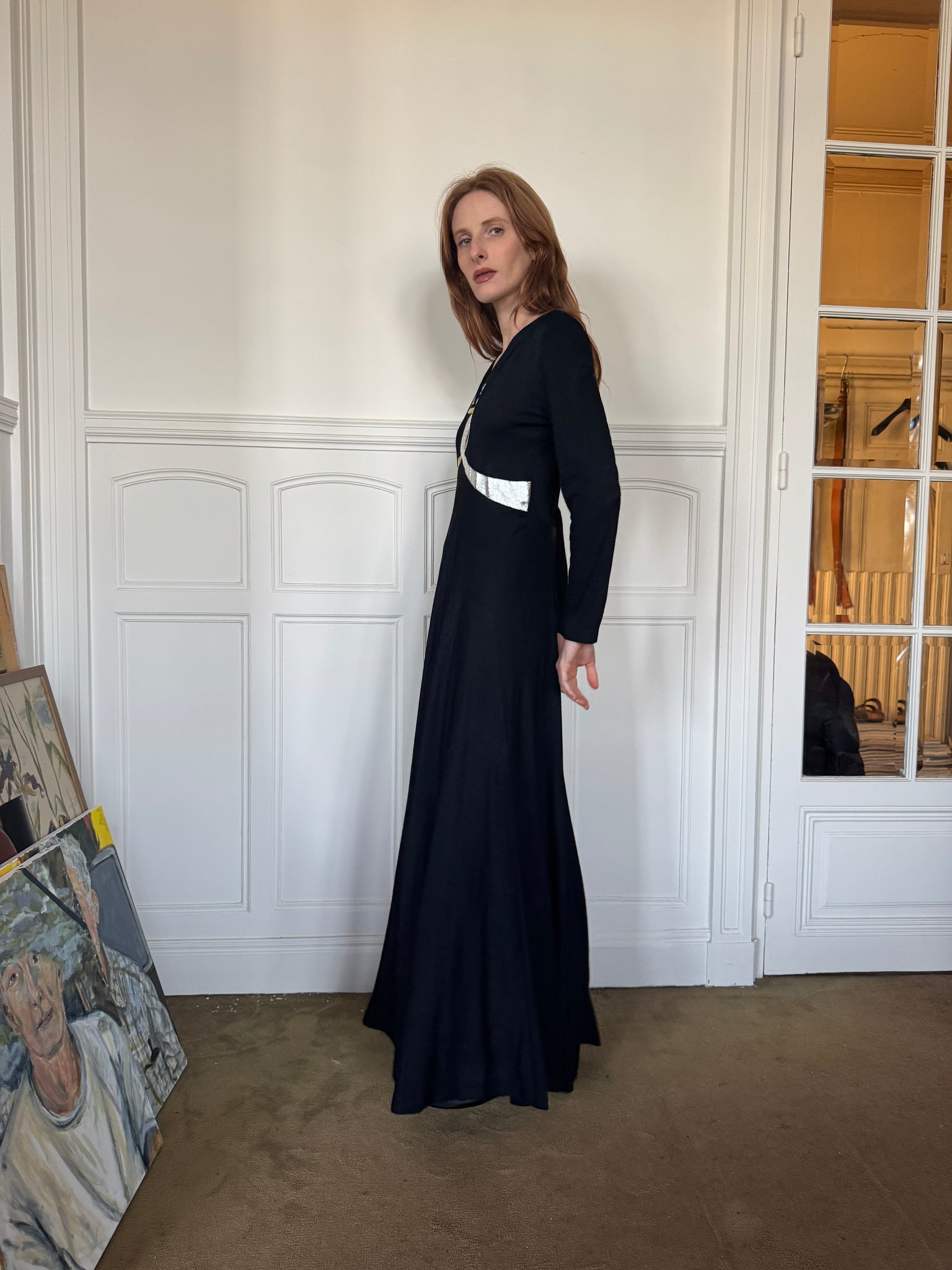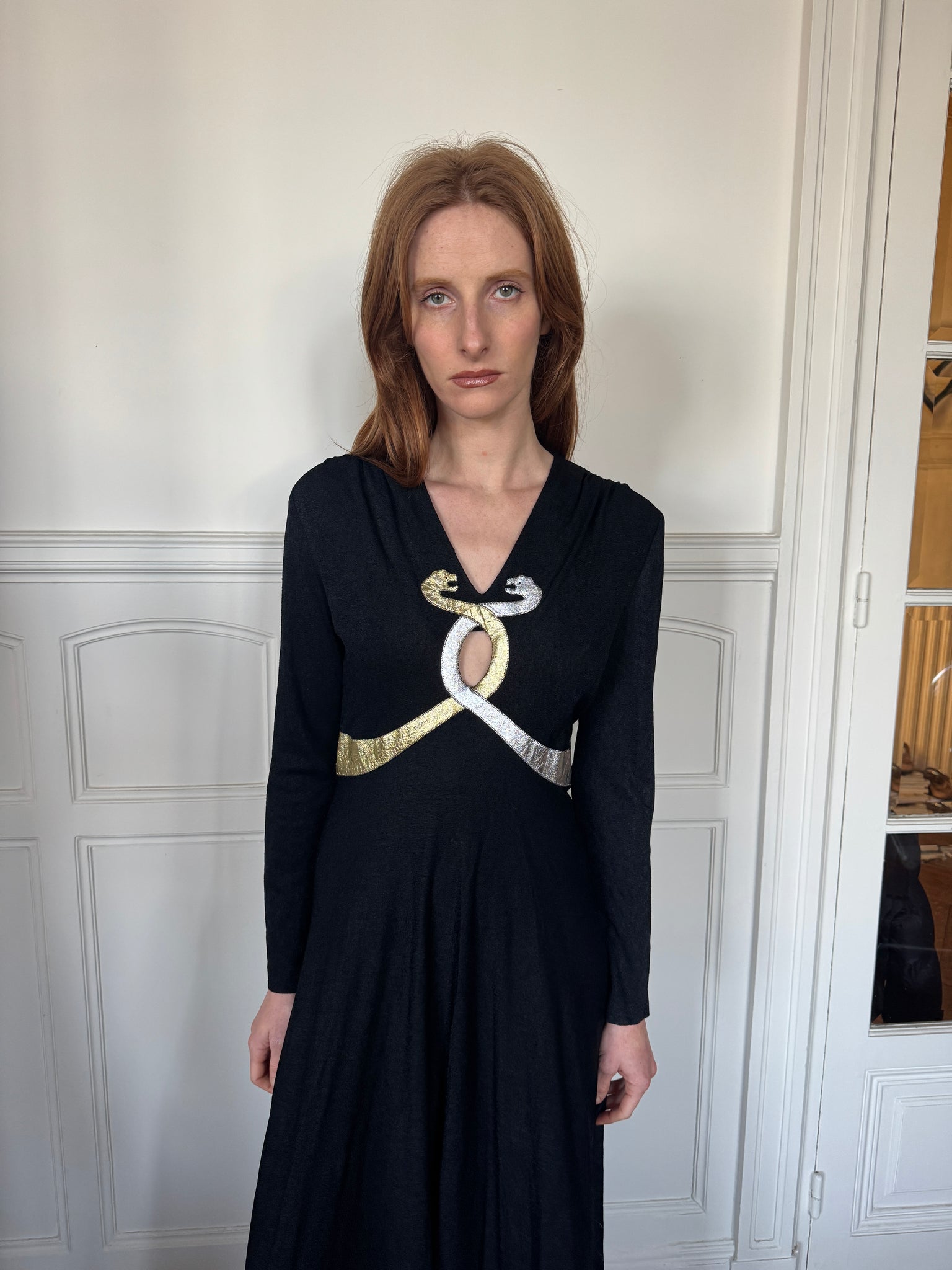 1970s snakes long dress, metallic leather snakes appliqués on black crepe poly, long sleeves, zipper in the back