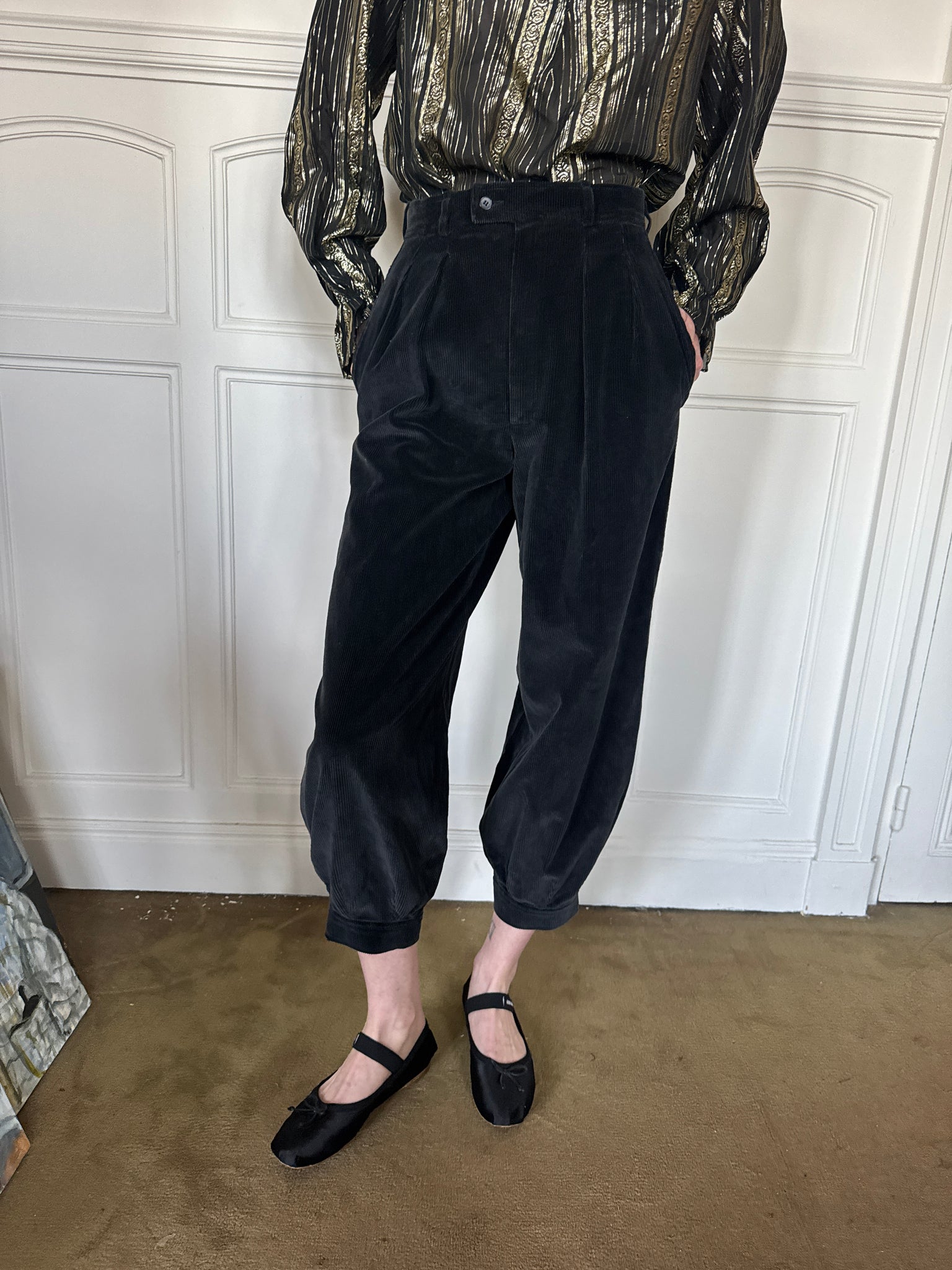 1970s Yves Saint Laurent Rive Gauche black corduroy capri pants, buttoned at cuffs, high waisted, side pockets, perfect condition, no use, no discoloration