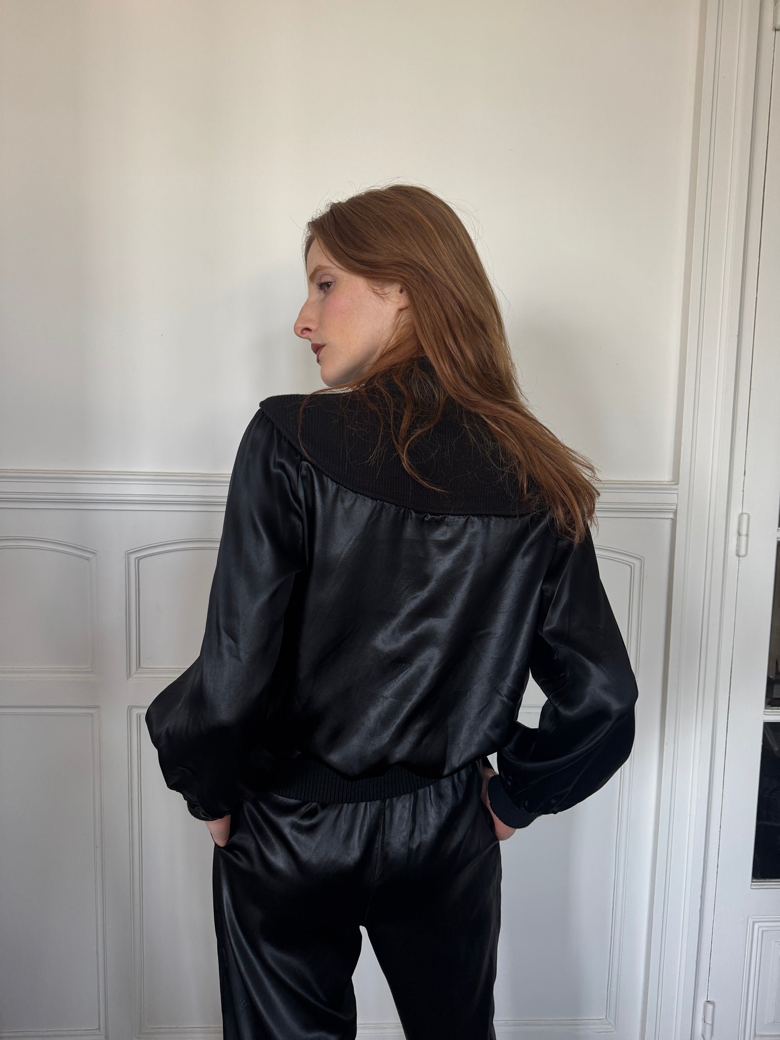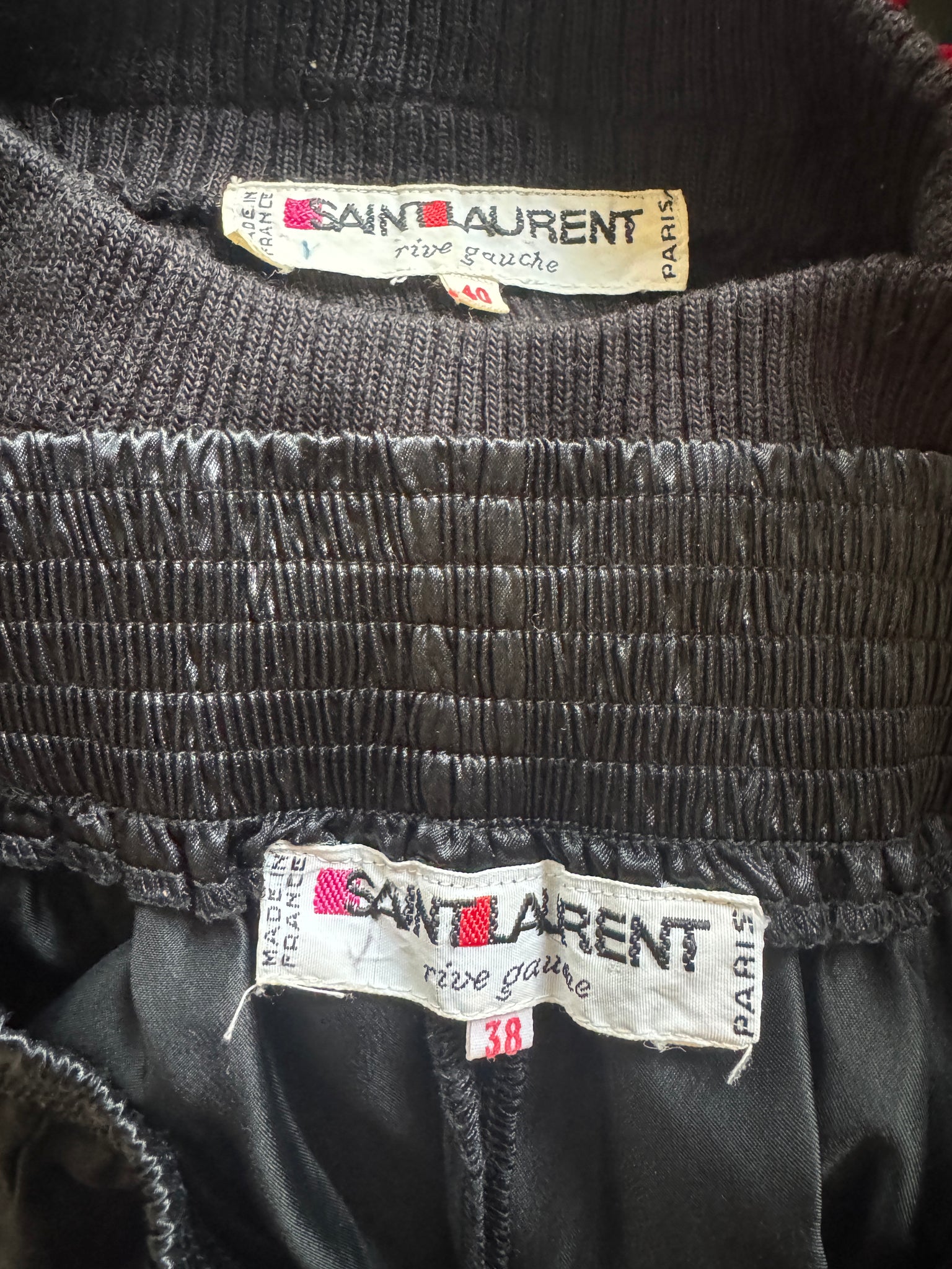 1980s Yves Saint Laurent Rive Gauche black satin and ribbed knit ensemble, tracksuit look, long sleeved top and pants