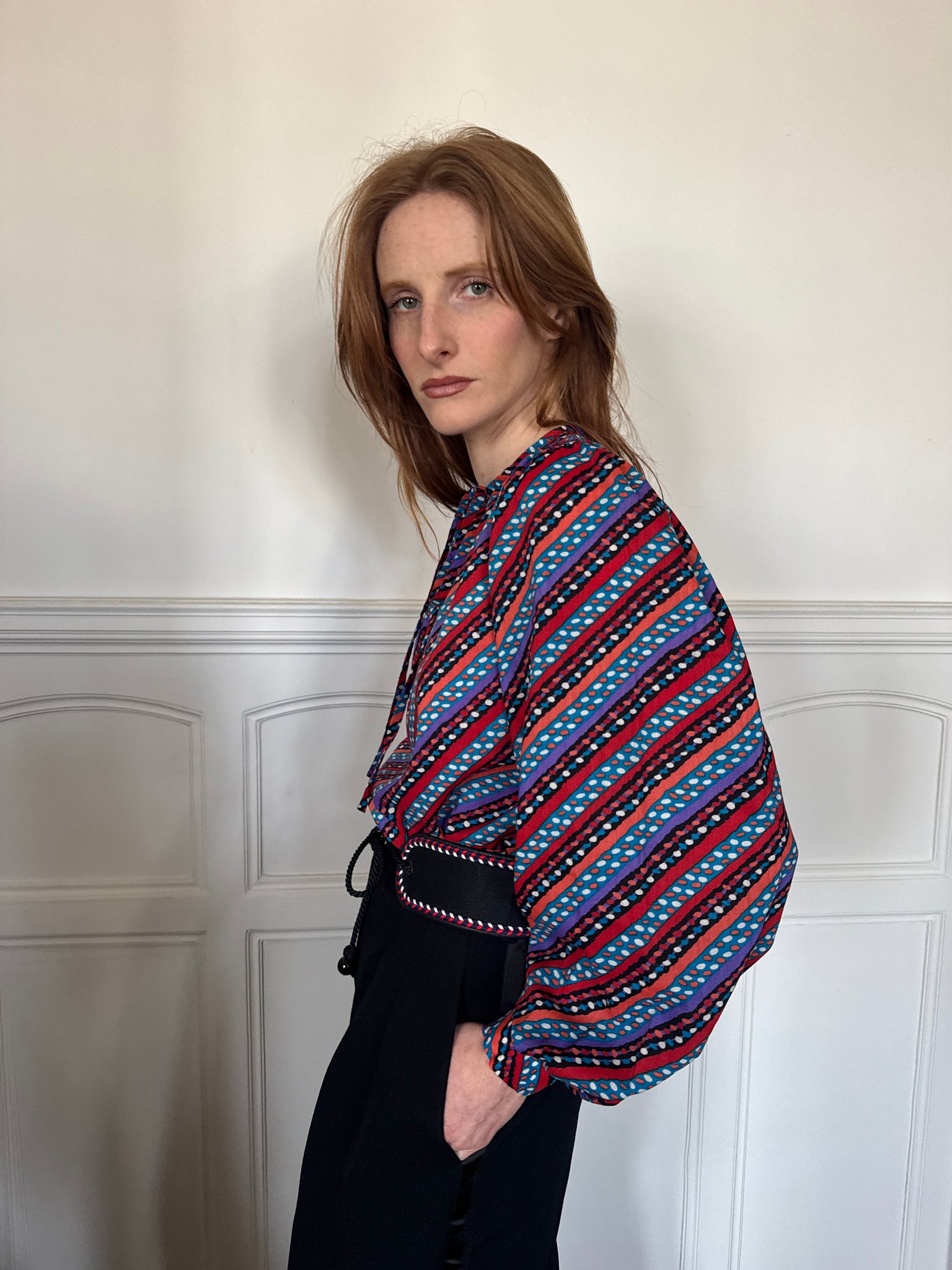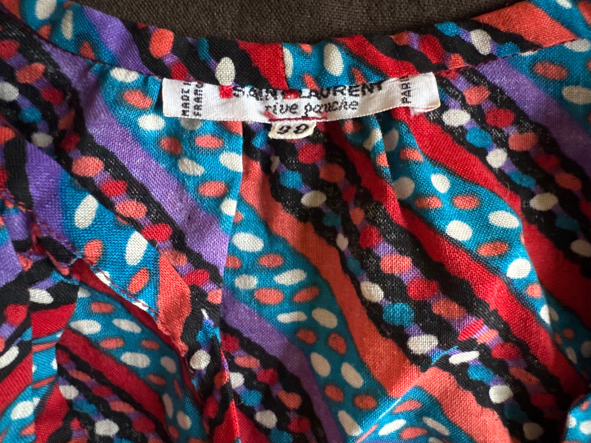 documented Fall Winter 1976 Ballets Russes collection Yves Saint Laurent Rive Gauche challis wool blouse, great print in bright colors, ties at neckline, long sleeves