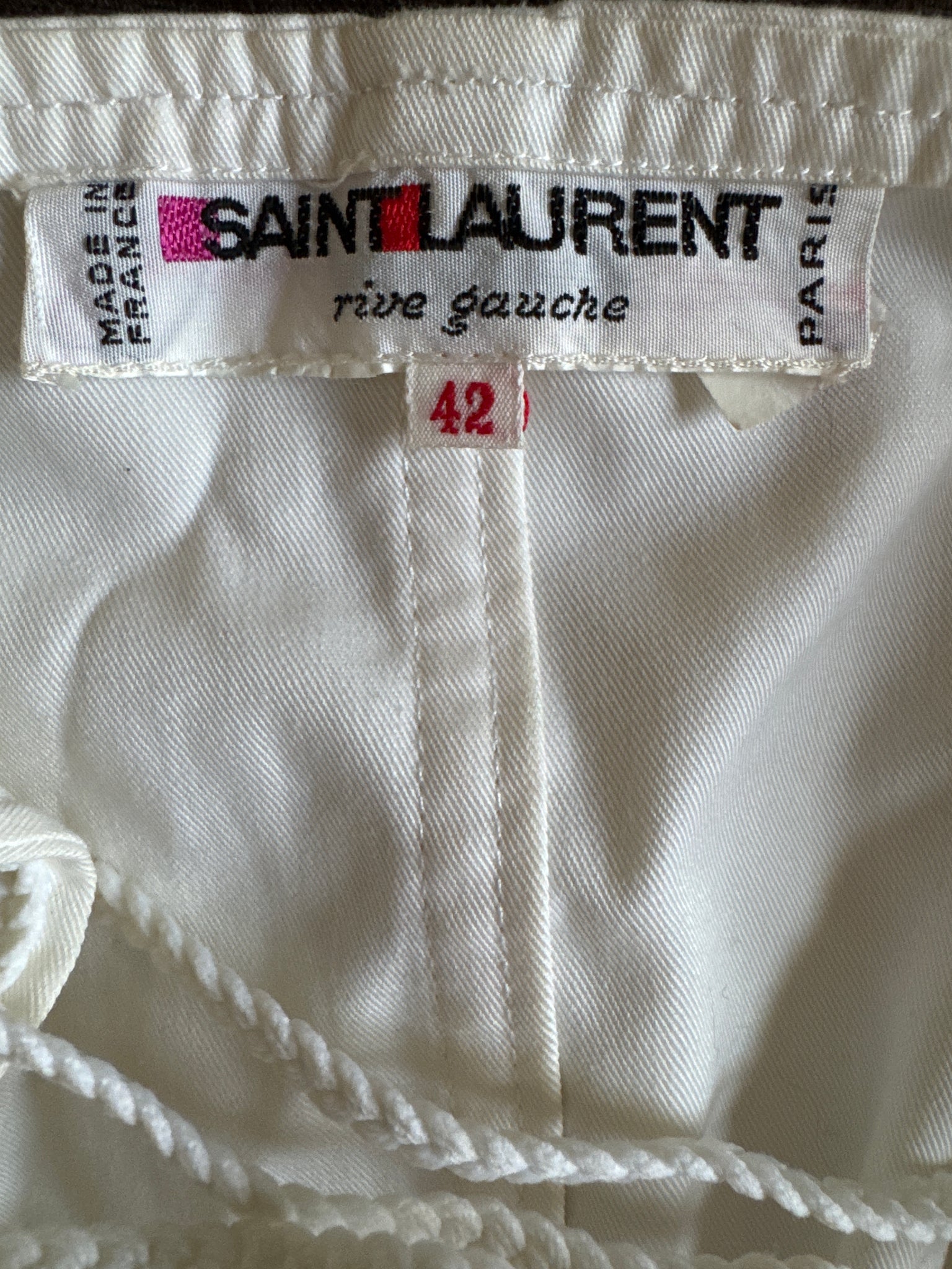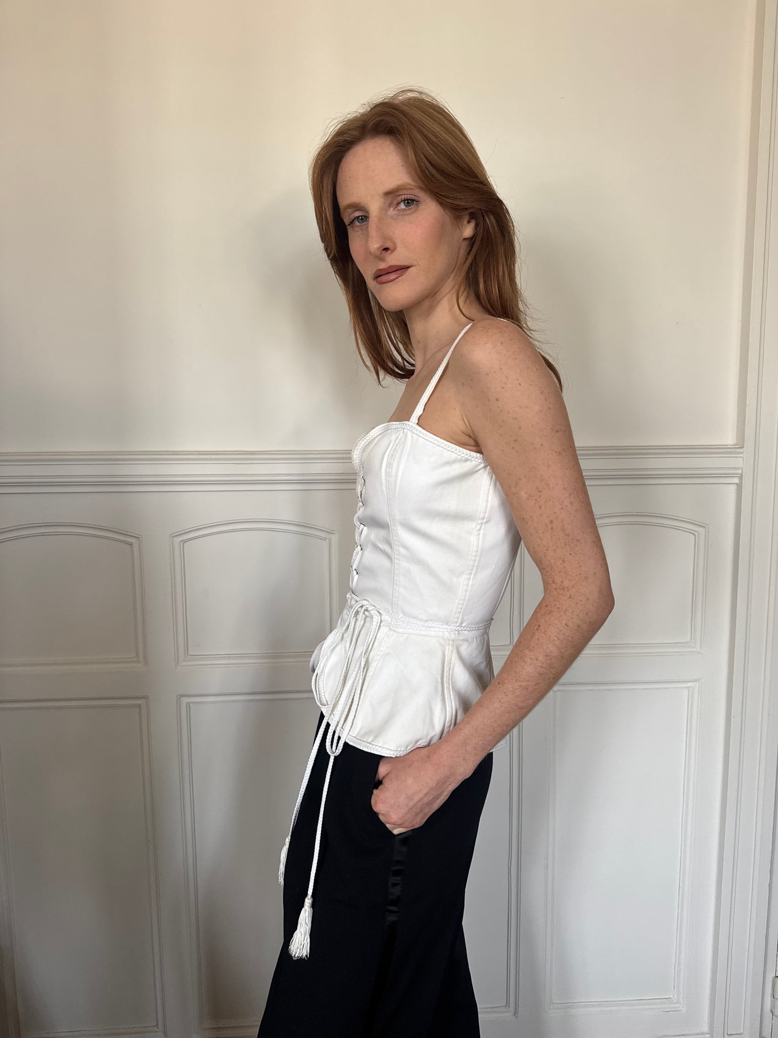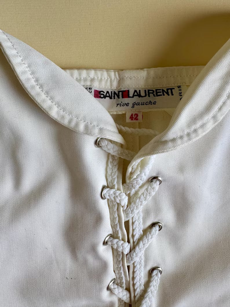documented Spring Summer 1977 Yves Saint Laurent Rive Gauche white corset, trimmings, laced up with pompoms, slight yellowing and marks due to its age, very hard to notice, zoom through the pictures, presents beautifully